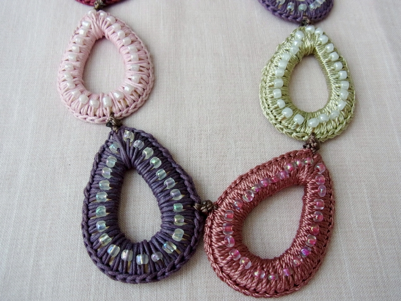 涙型モチーフを光沢のある糸でくるんで、その途中にビーズを通しています。