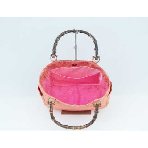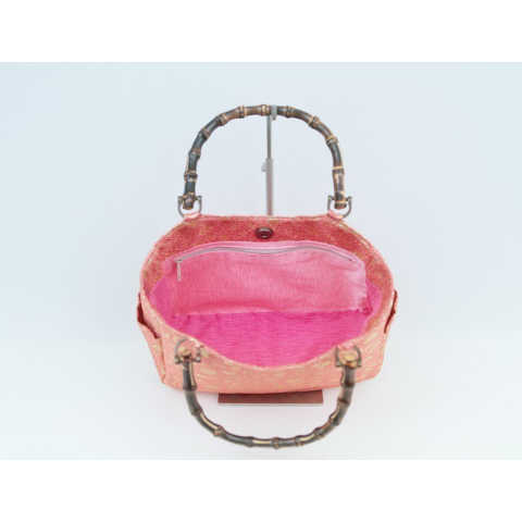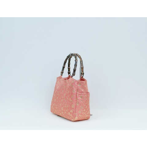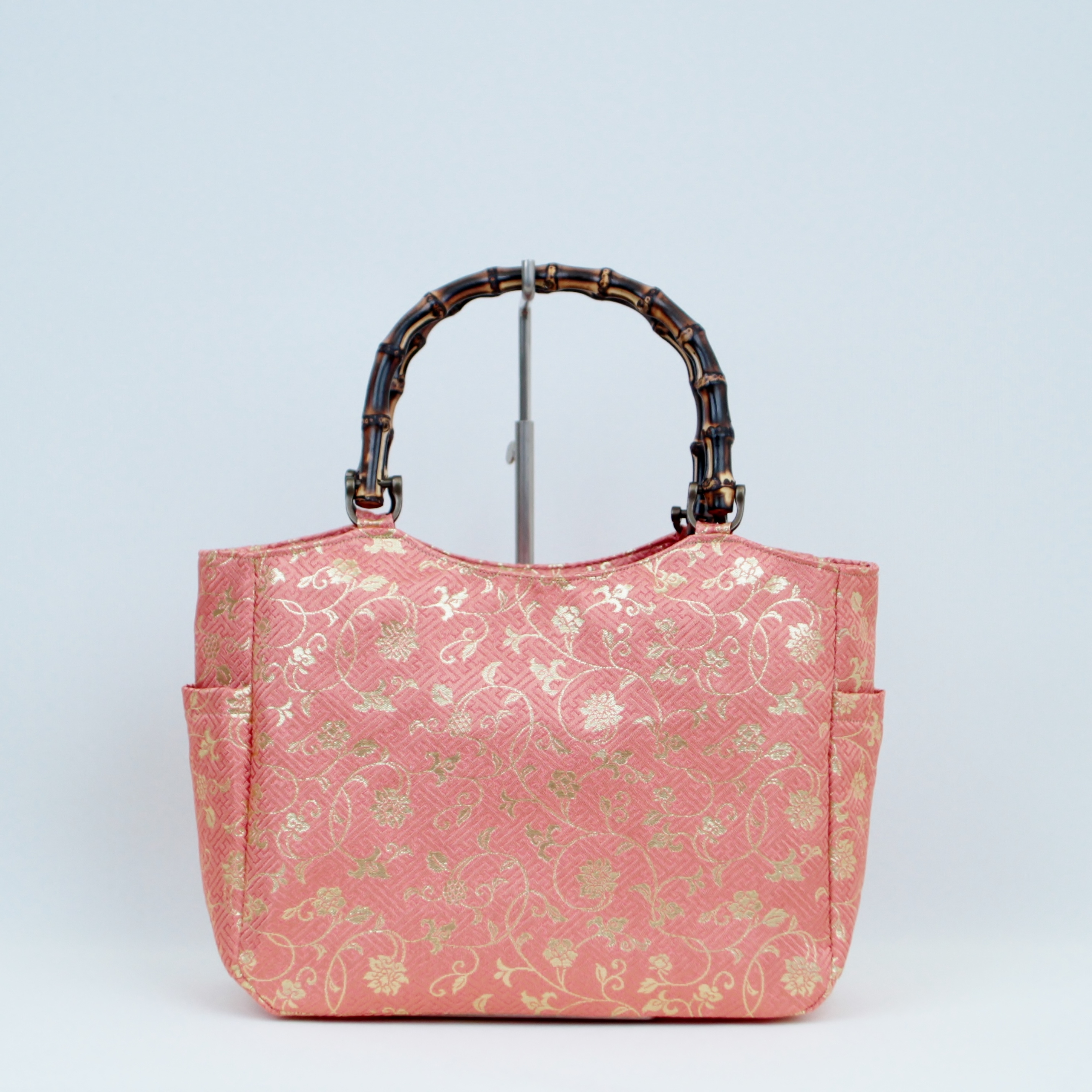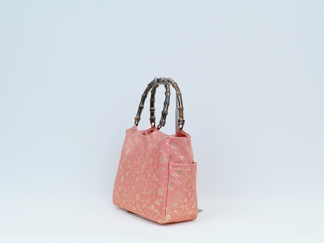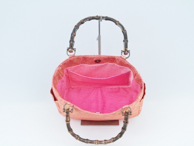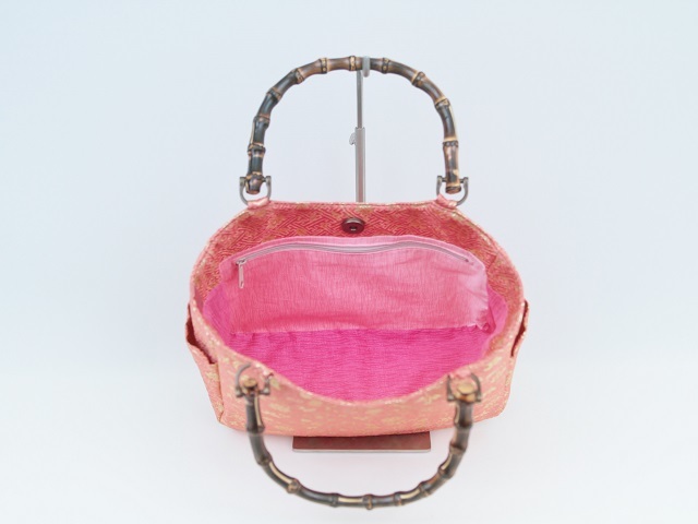 張り感のあるしっかりとした帯地で製作しました。ちょっとしたShoppingやお出掛けにも便利なサイズ。持ち手がバンブーなので爽やか!洋装・和装問わずご活用いただける1品です。■サイズ:約 W 26cm x H(バッグ口まで)18cm x D 10cm持ち手:約 32cm