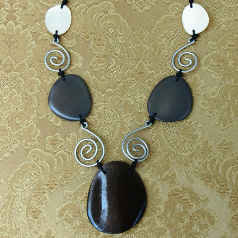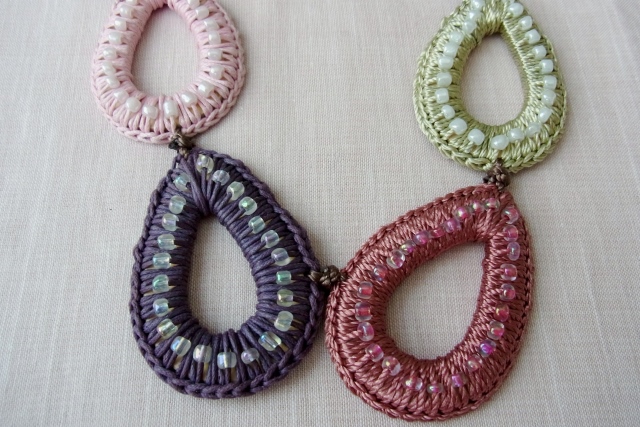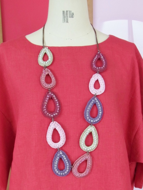 フランスから輸入の個性的で大人キュートなネックレス涙型モチーフを光沢のある糸でくるんで、その途中にビーズを通しています。とっても手の込んだパーツをつなげています。5色2個ずつで、後ろ部分は紐でボタンをループに通して留めるようになっています。■サイズ:長さ 約 100 cm(調節はできません)